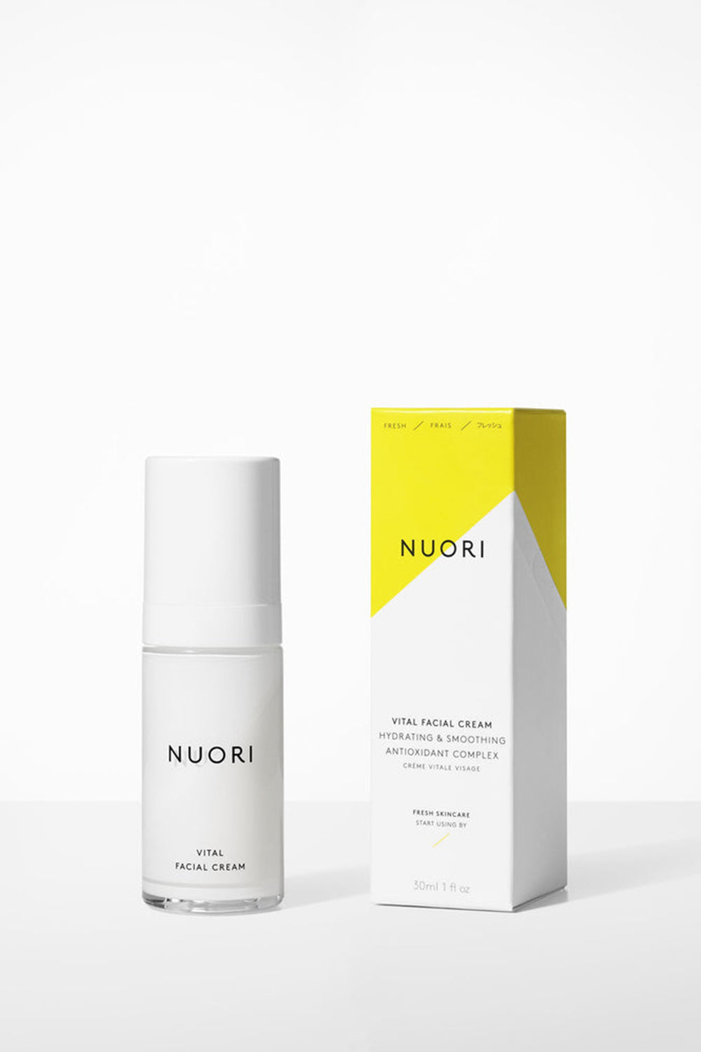 NUORI’s Vital Facial Cream is a lightweight cream, which brings back the skin’s vitality and helps prevent and reduce first signs of aging. Formulated with a unique split form of hyaluronic acid, which is able to penetrate deeper into the skin, the cream restores the skin’s natural moisture levels. Botanical squalane, jojoba oil, and sweet almond oil nourish skin, leaving it smooth and supple. A complex of shea butter, vitamin C, and vitamin E offers antioxidant protection. Easily absorbed, this cream is ideal for under makeup or alone.