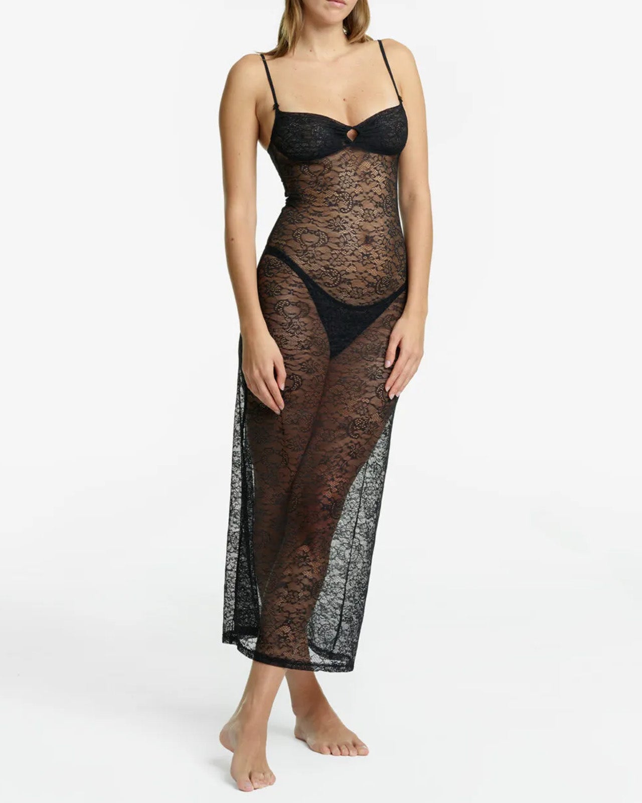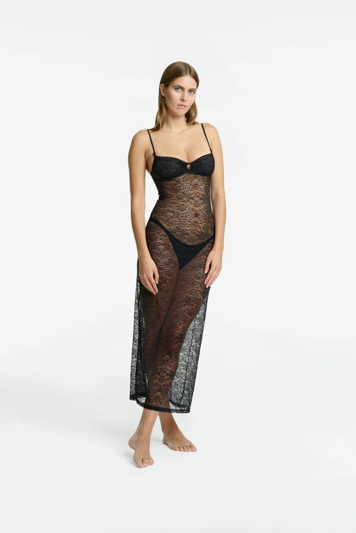 A delicate long dress in French lace with floral print. Little flower sewn on each side.