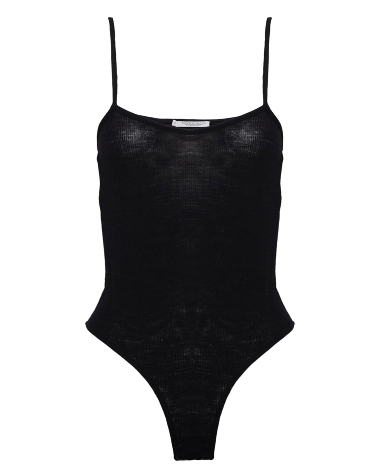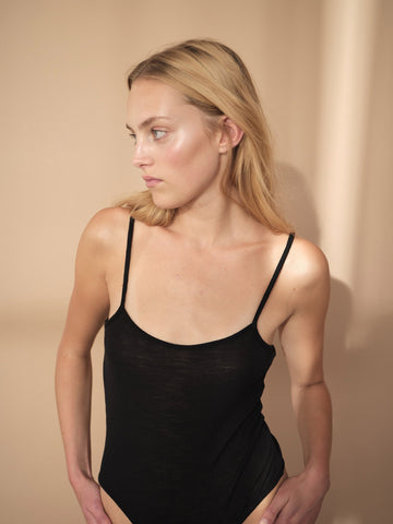 Amalie rib bodystocking is made in 100% wool and will keep you warm and comfortable. The bodystocking has a deep cut featuring thin straps. Perfect for layering.