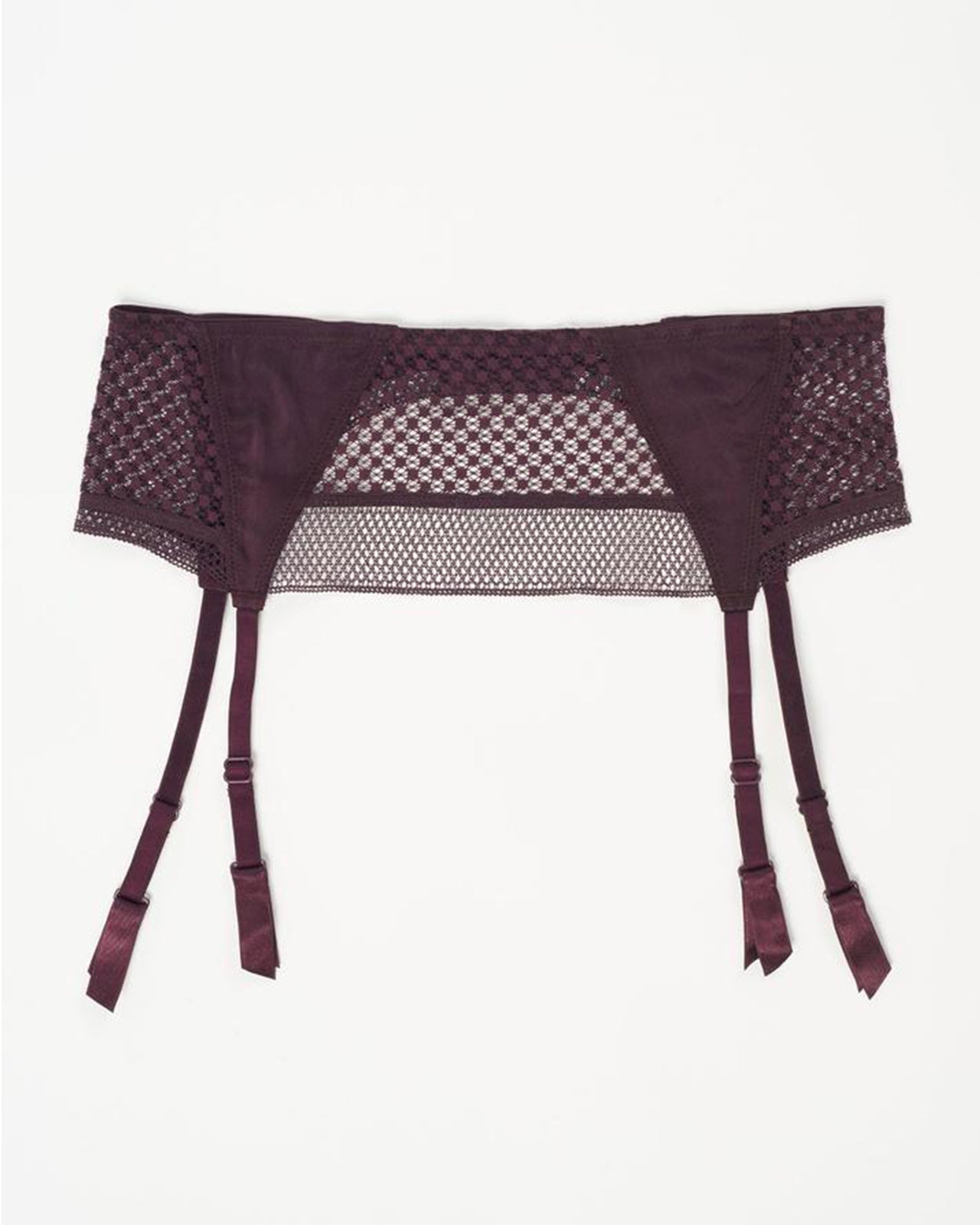 The Bella garter belt pairs triangular silk panels with a stretch pointelle mesh. The perfect companion to the Bella soft cup triangle bra. Adjustable straps, hook and eye closure in back.