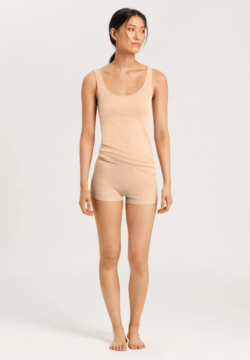 Tank top in soft mercerized cotton with edge trim in silk satin.