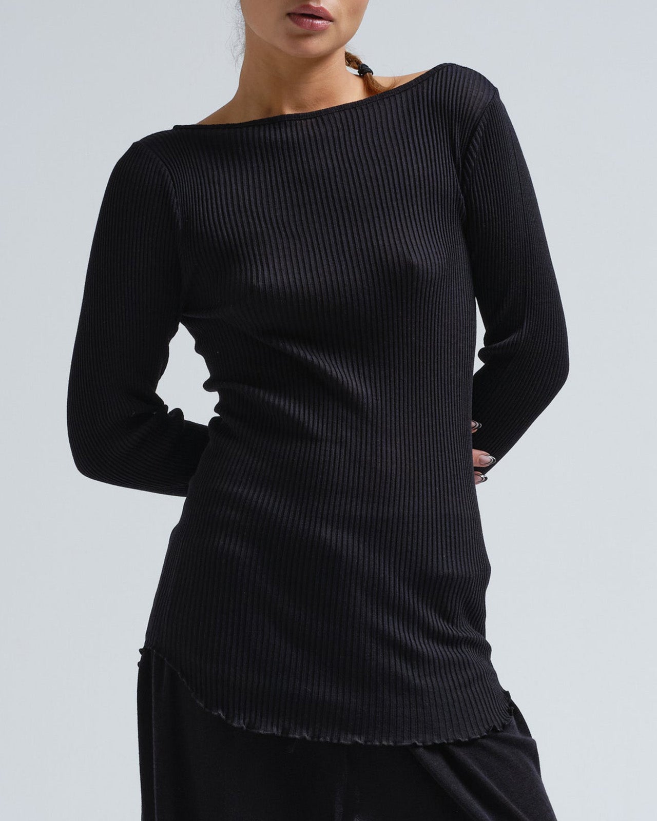 Long-sleeved t-shirt featuring a boat neckline and no side seams. The top is crafted from mulesing-free merino wool in a 5x5 ribbed knit.