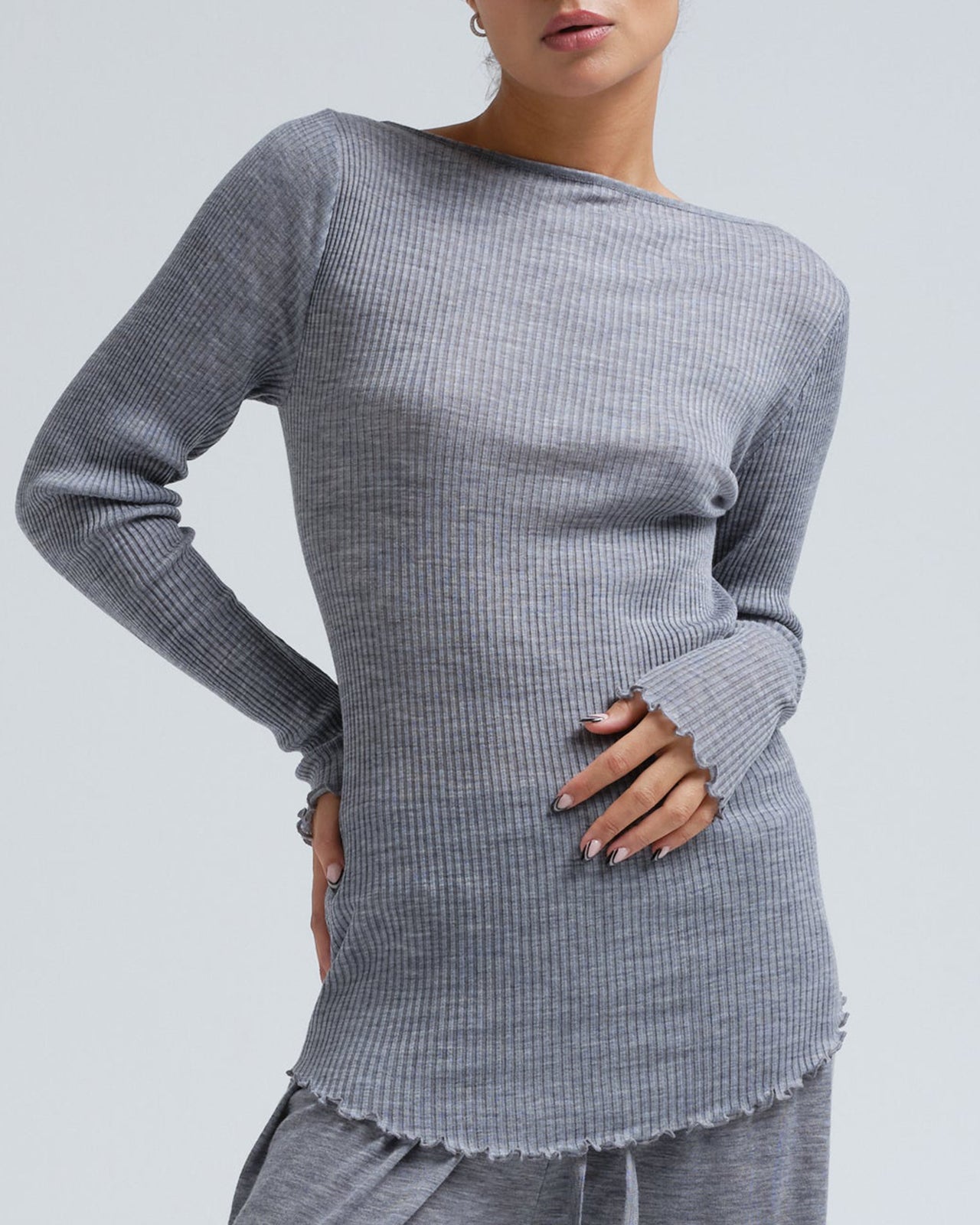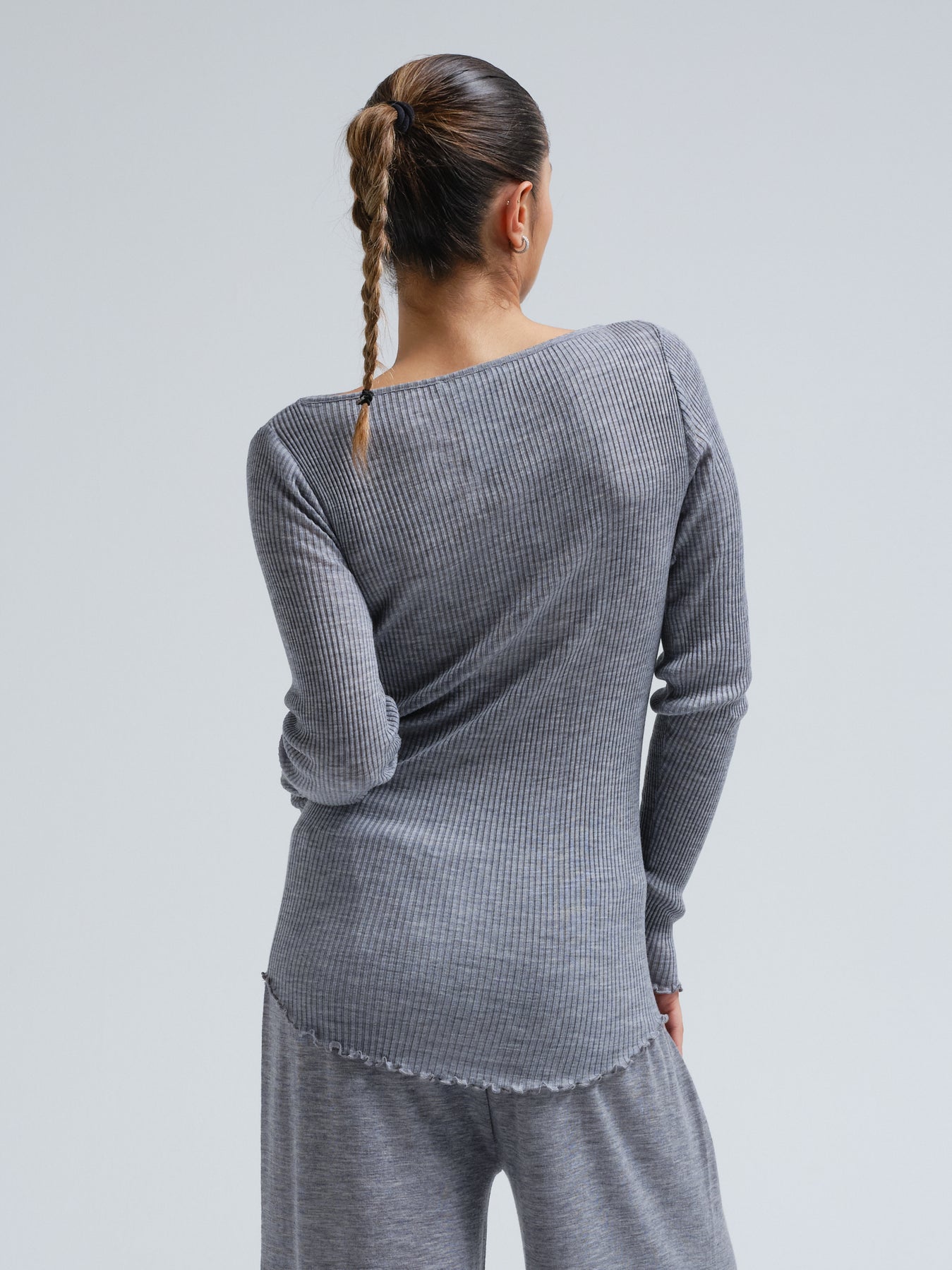 Long-sleeved t-shirt featuring a boat neckline and no side seams. The top is crafted from mulesing-free merino wool in a 5x5 ribbed knit.