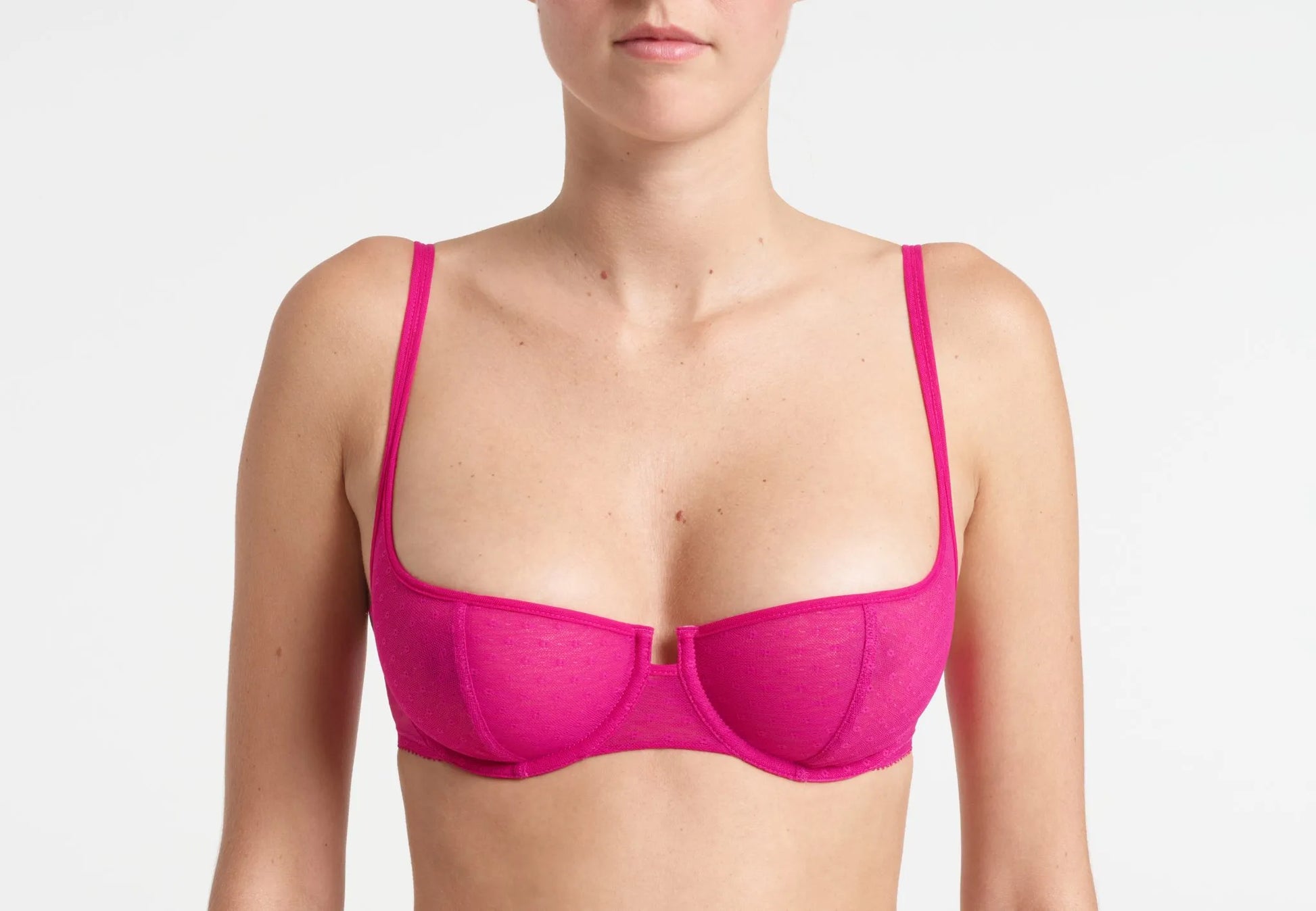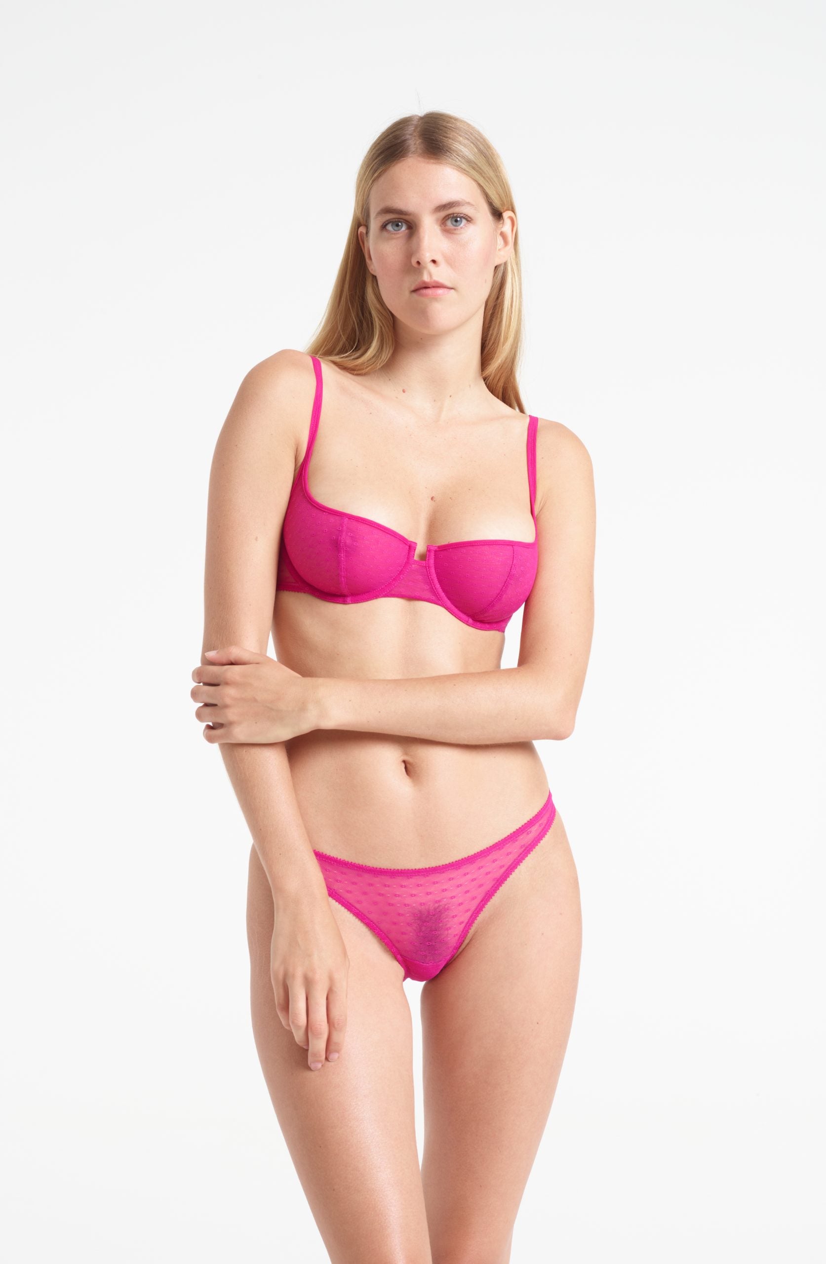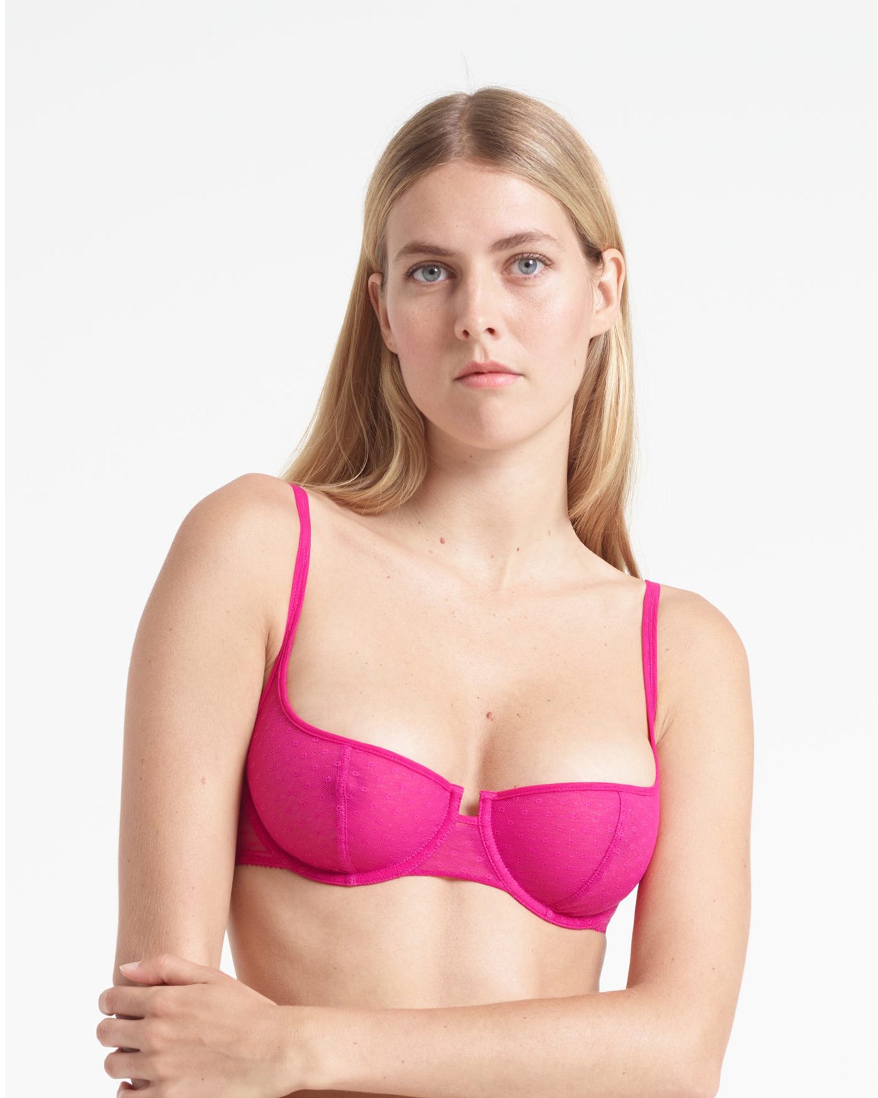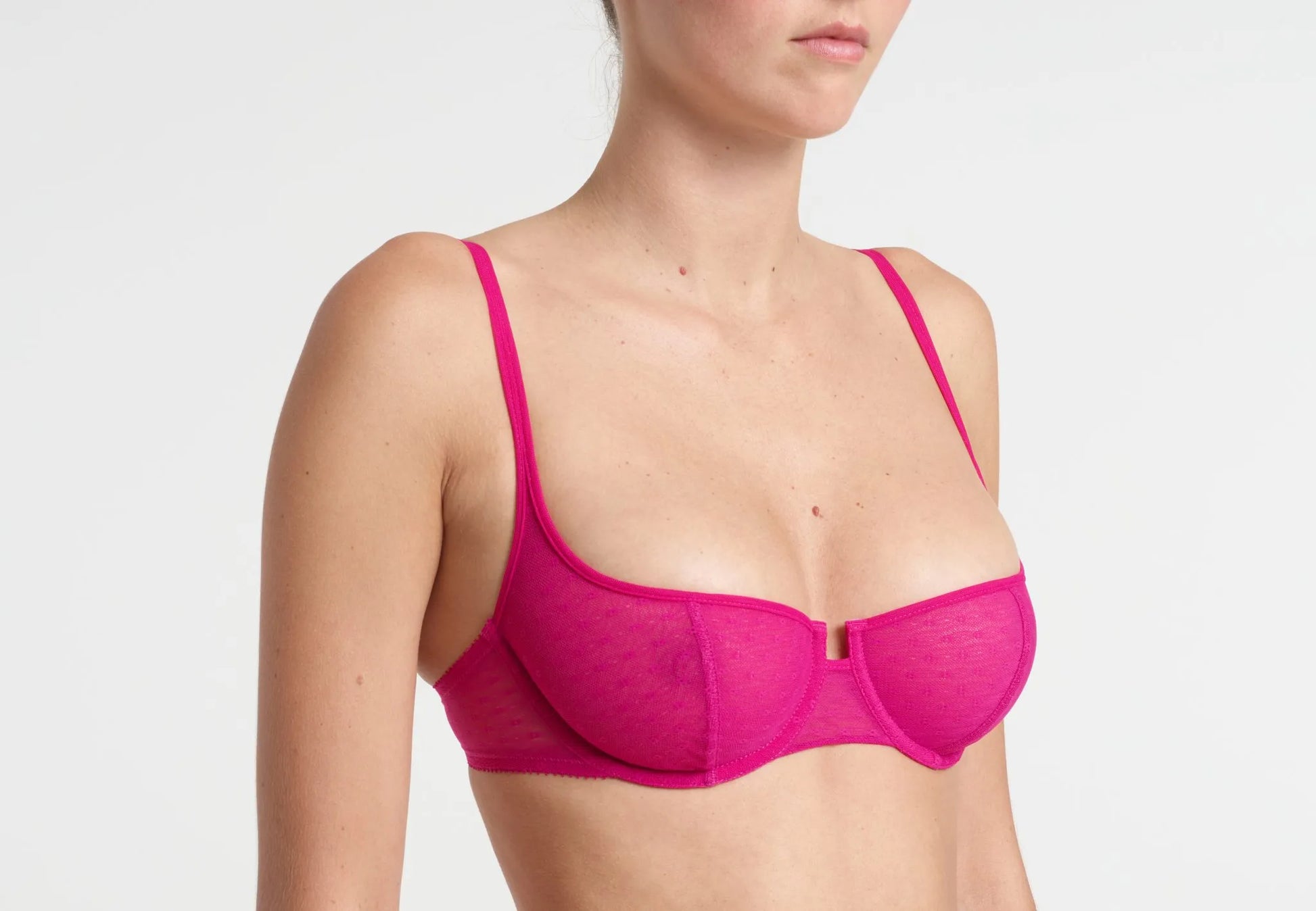 Joanne balcony bra is made from delicate point d’esprit tulle. The bra has a perfect cut for a low neck line and is designed for a maximum décolleté effect.