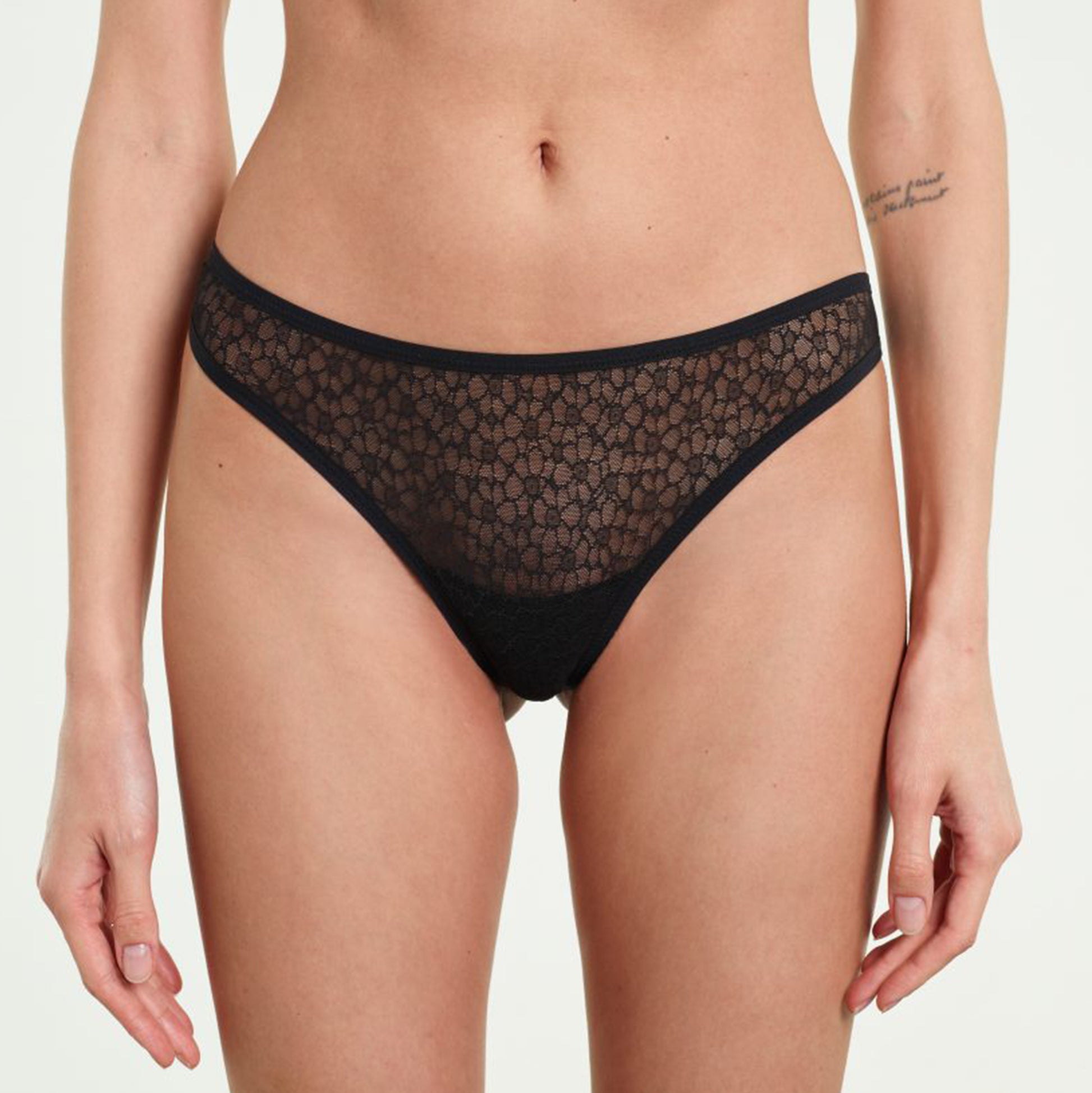 A low waist thong made from delicate flowery stretch tulle. The fabric is soft and elastic.