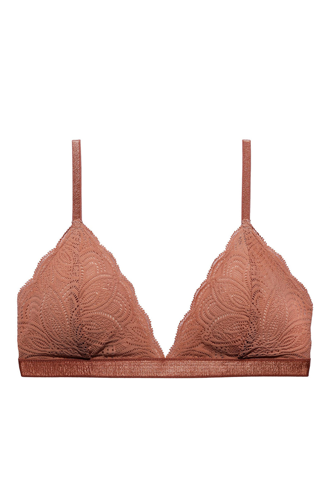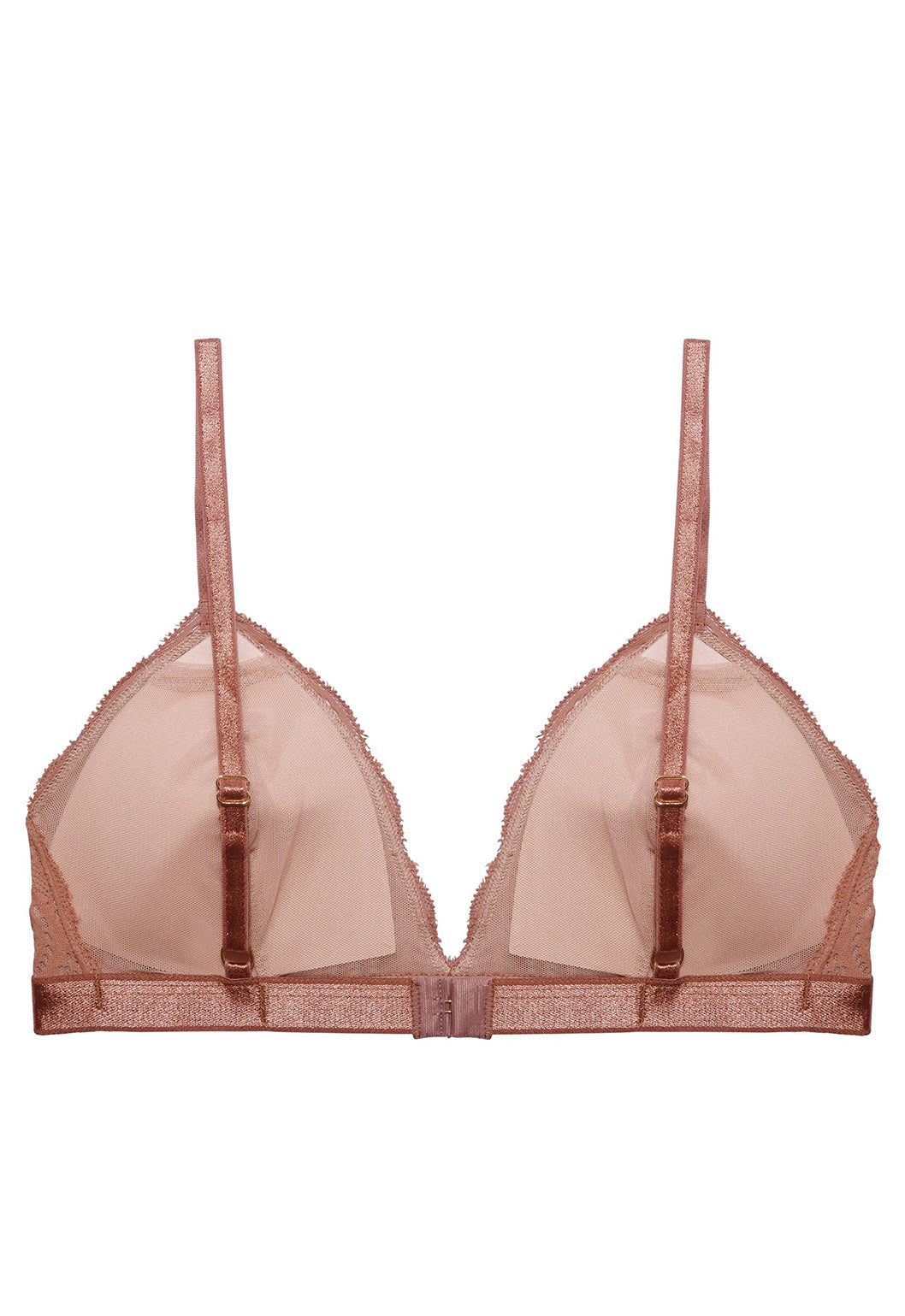 The Luna bra is made of elegant lace with fine wavy edges and a beige mesh lining.
