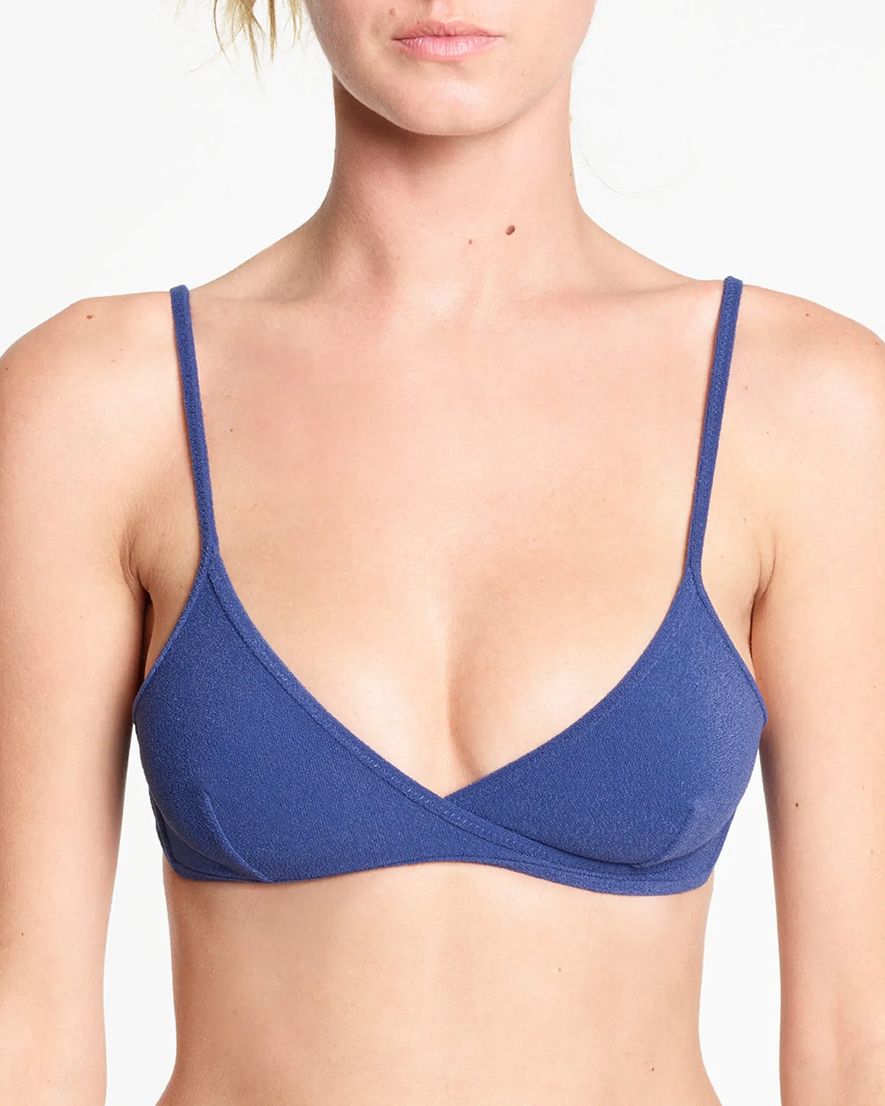 Cross-over triangle top with adjustable shoulder straps and back-tie. The construction gives good support up to a 75D cup.