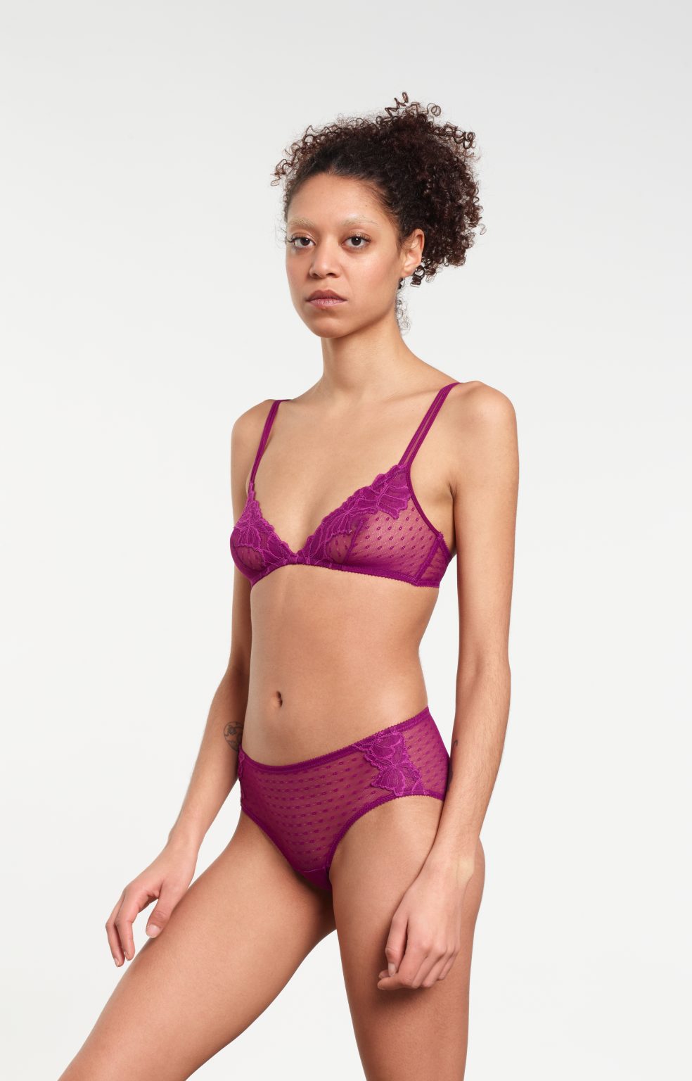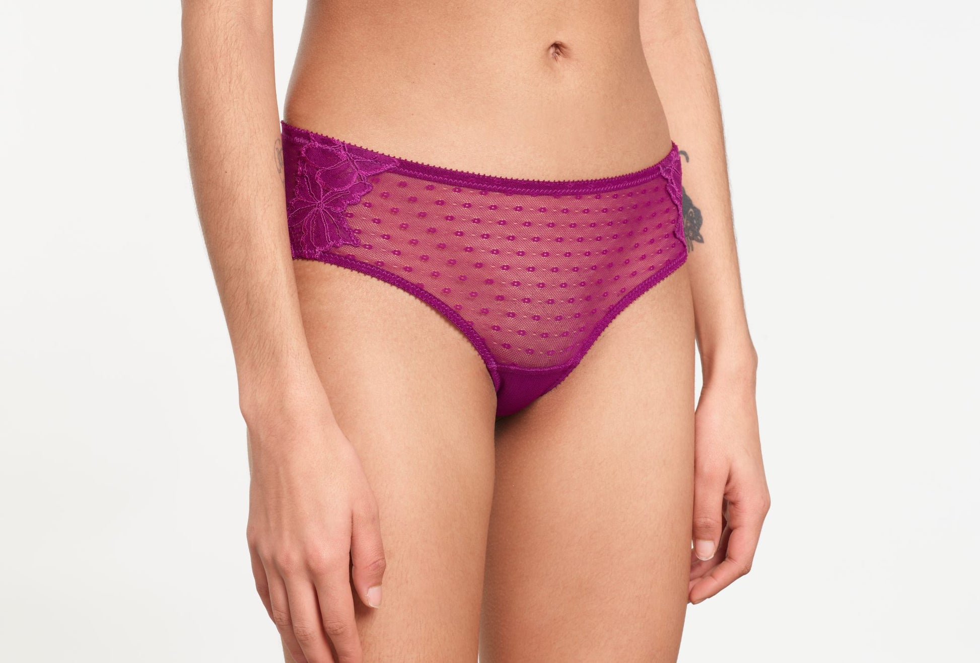 A mid waist panty made from fine tulle with French flowery lace details from Calais, France.