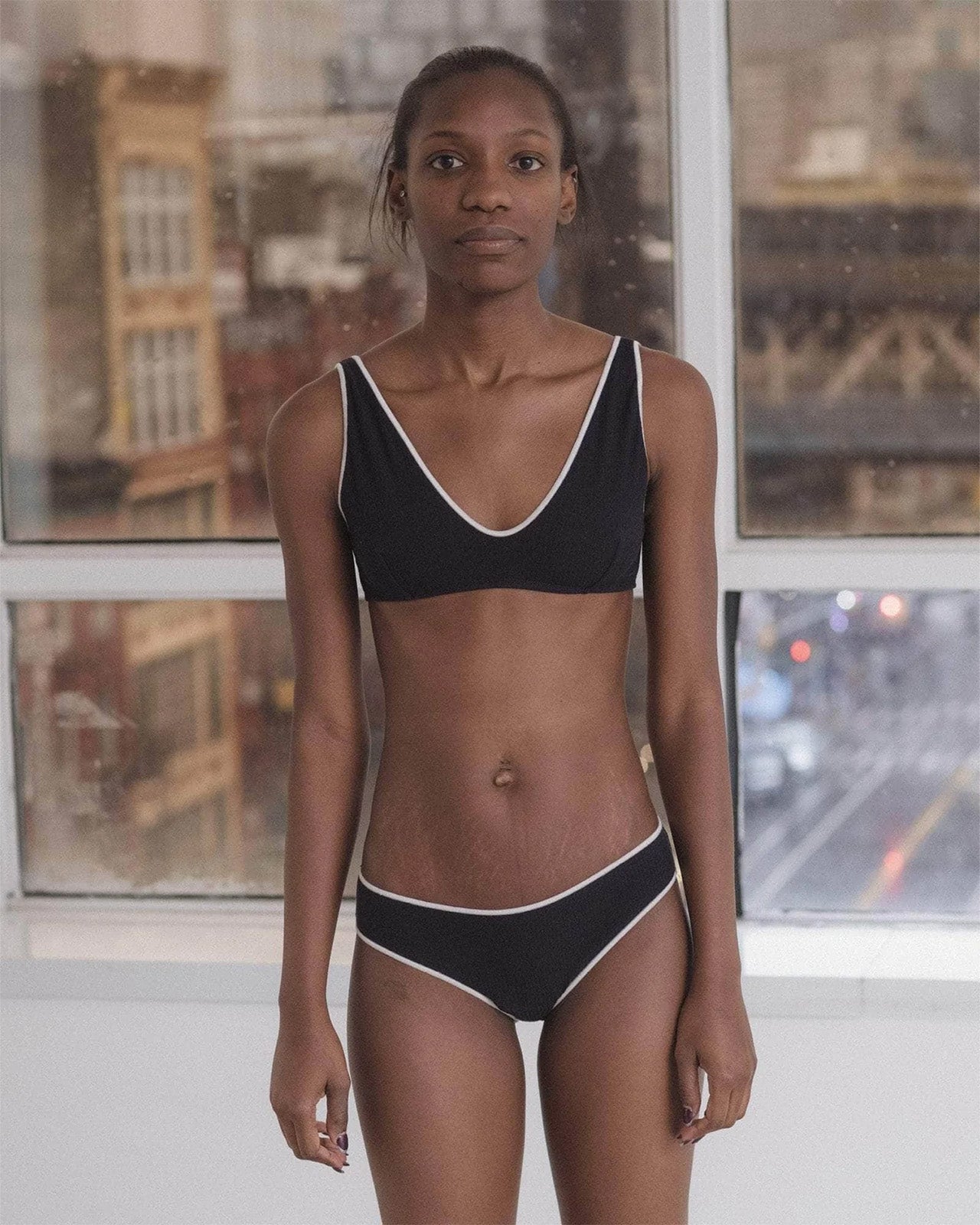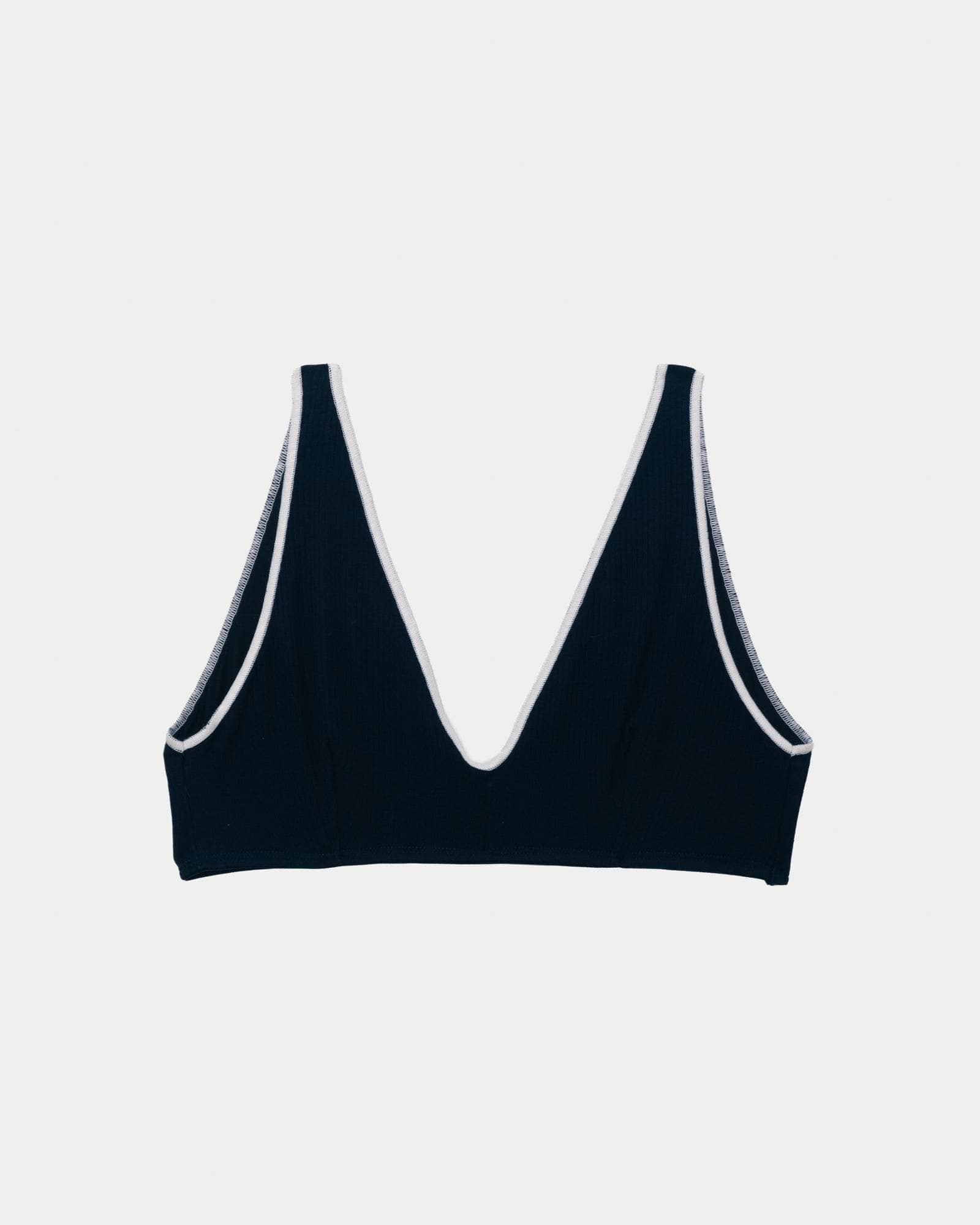 A fine cotton rib bra with a deep v neck and contrast overlock seams. The bra is fully lined. It is most supportive for a small to a medium bust.