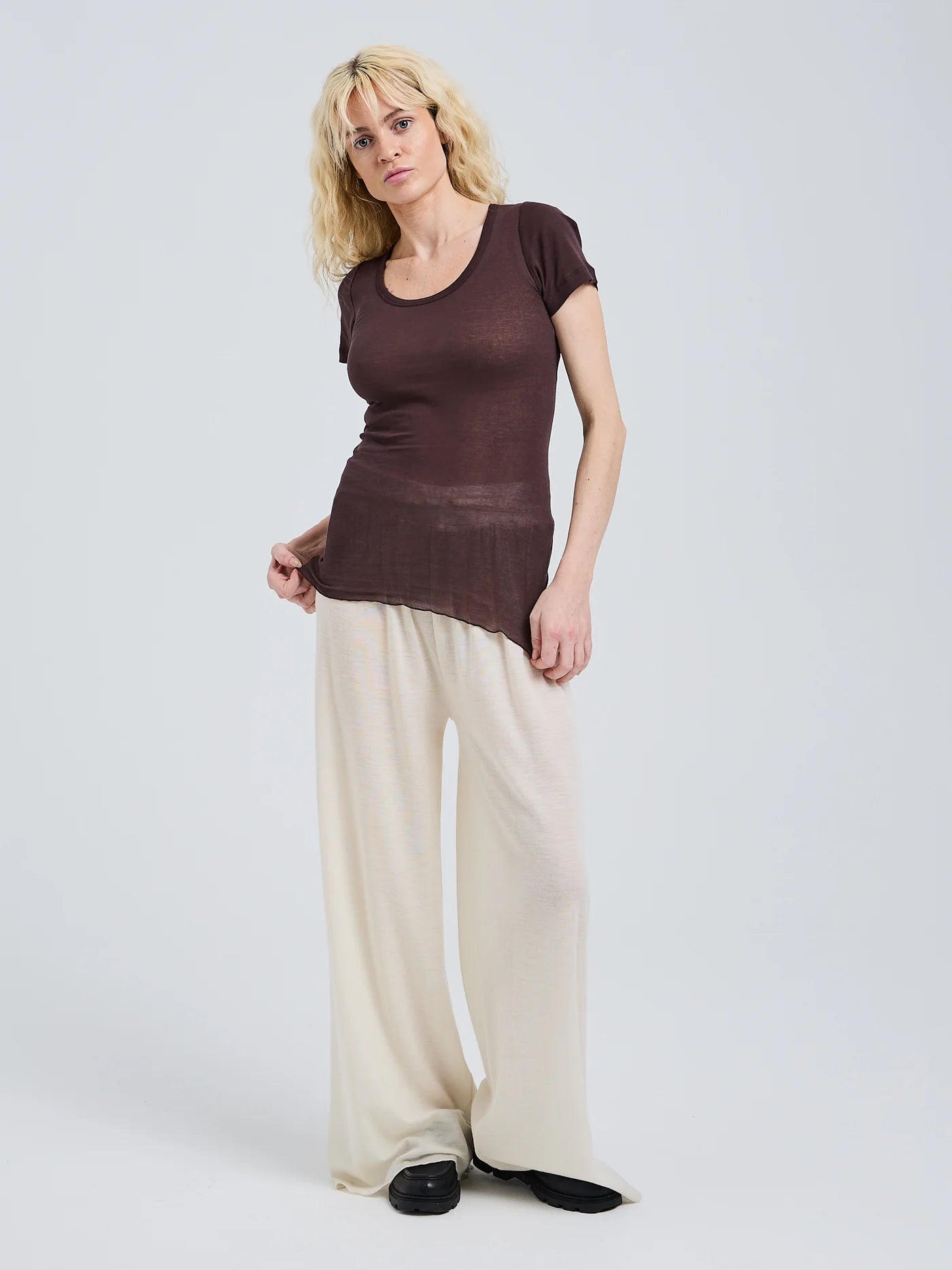 Short sleeved t-shirt made in 100% breezy and soft cotton. The t-shirt has overlocked bottom edges and featuring a scooped round neck.