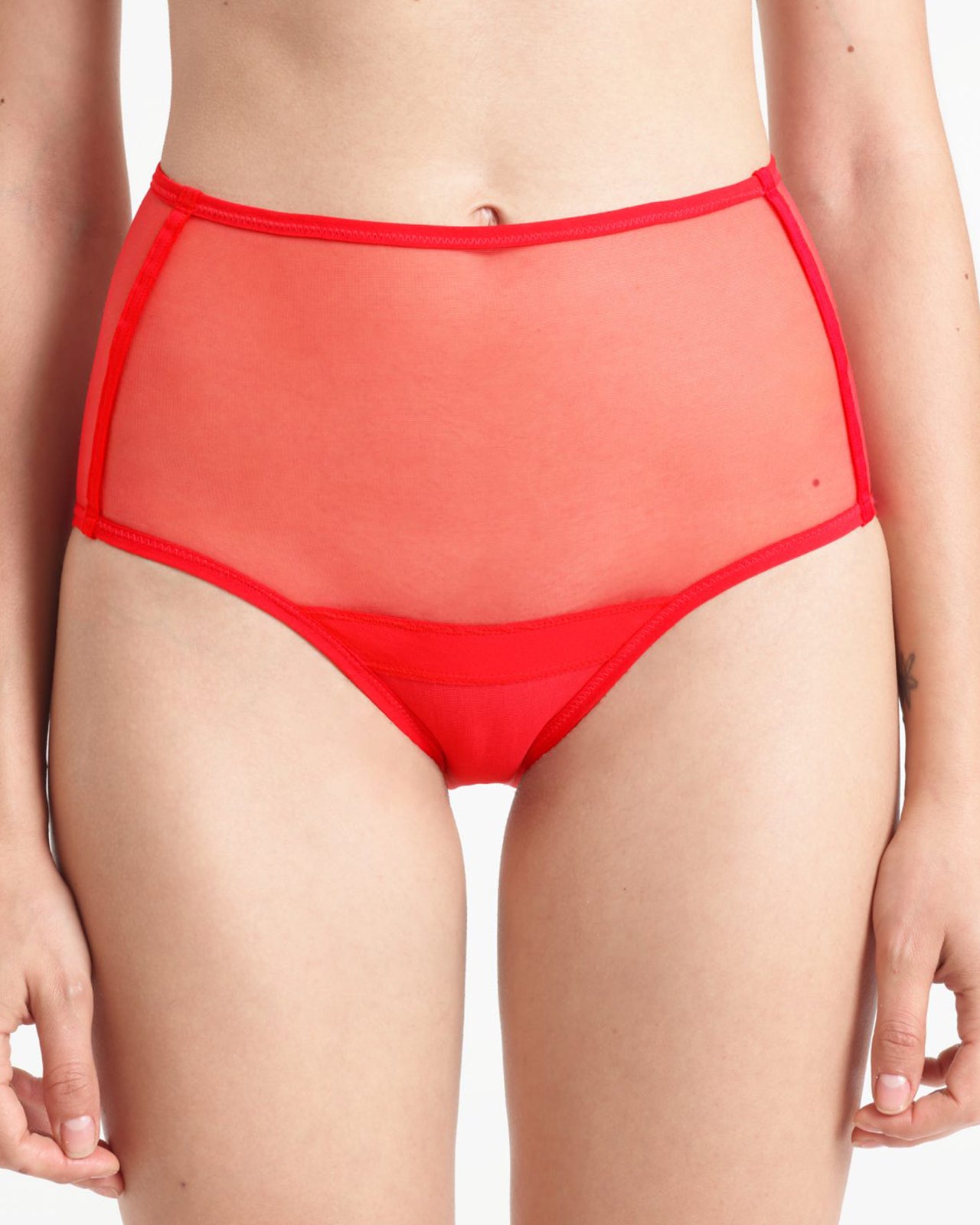 A high waist panty made from a stretch tulle with muslin ribbons.