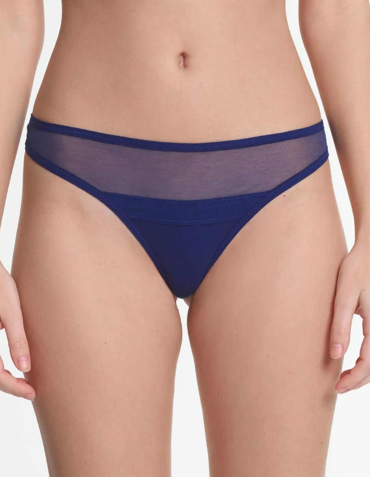 A low waist thong made from a stretch tulle with muslin ribbons.