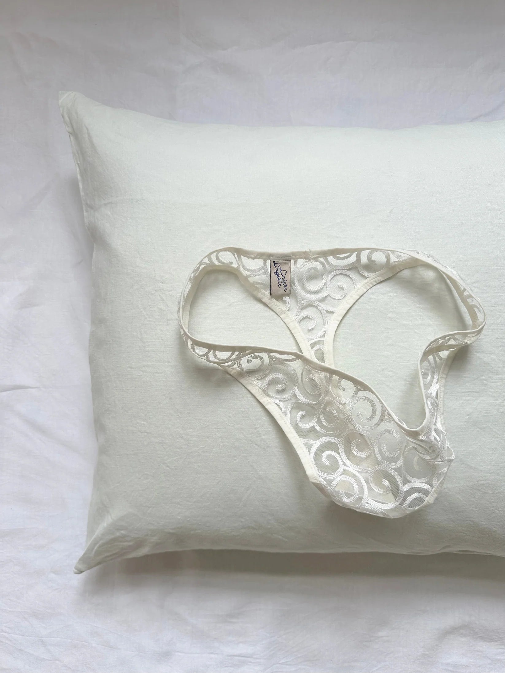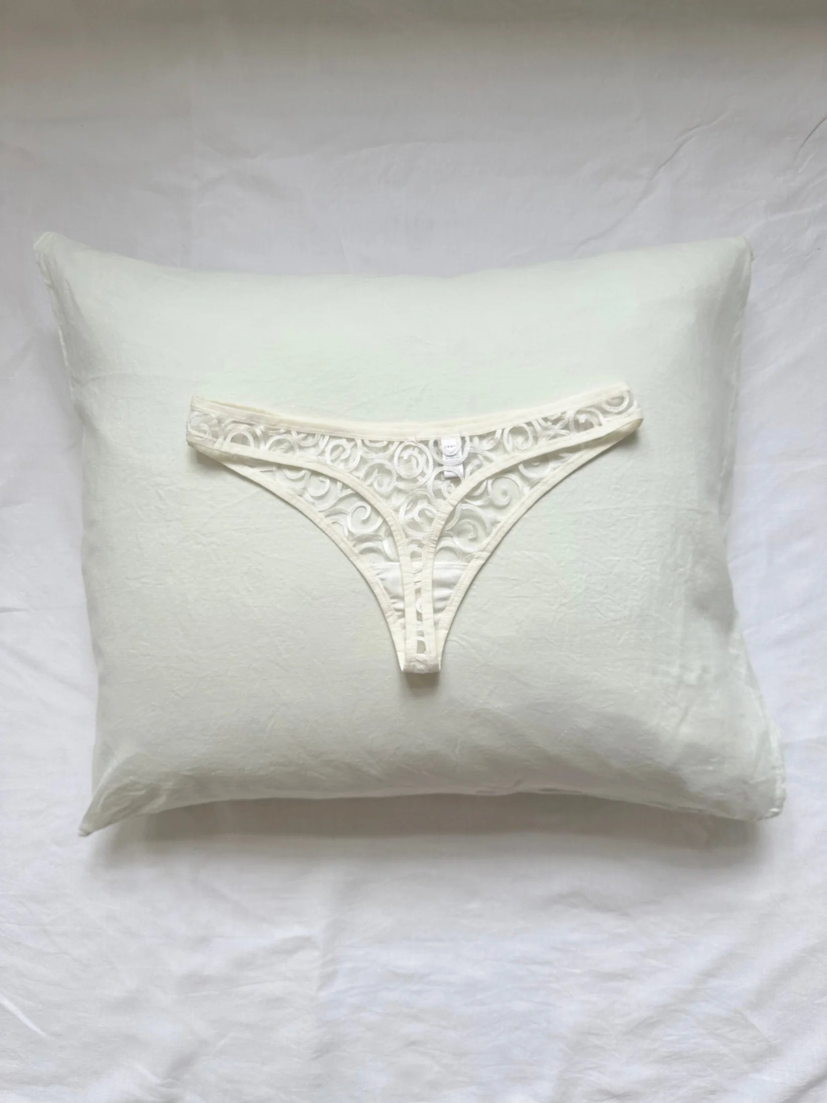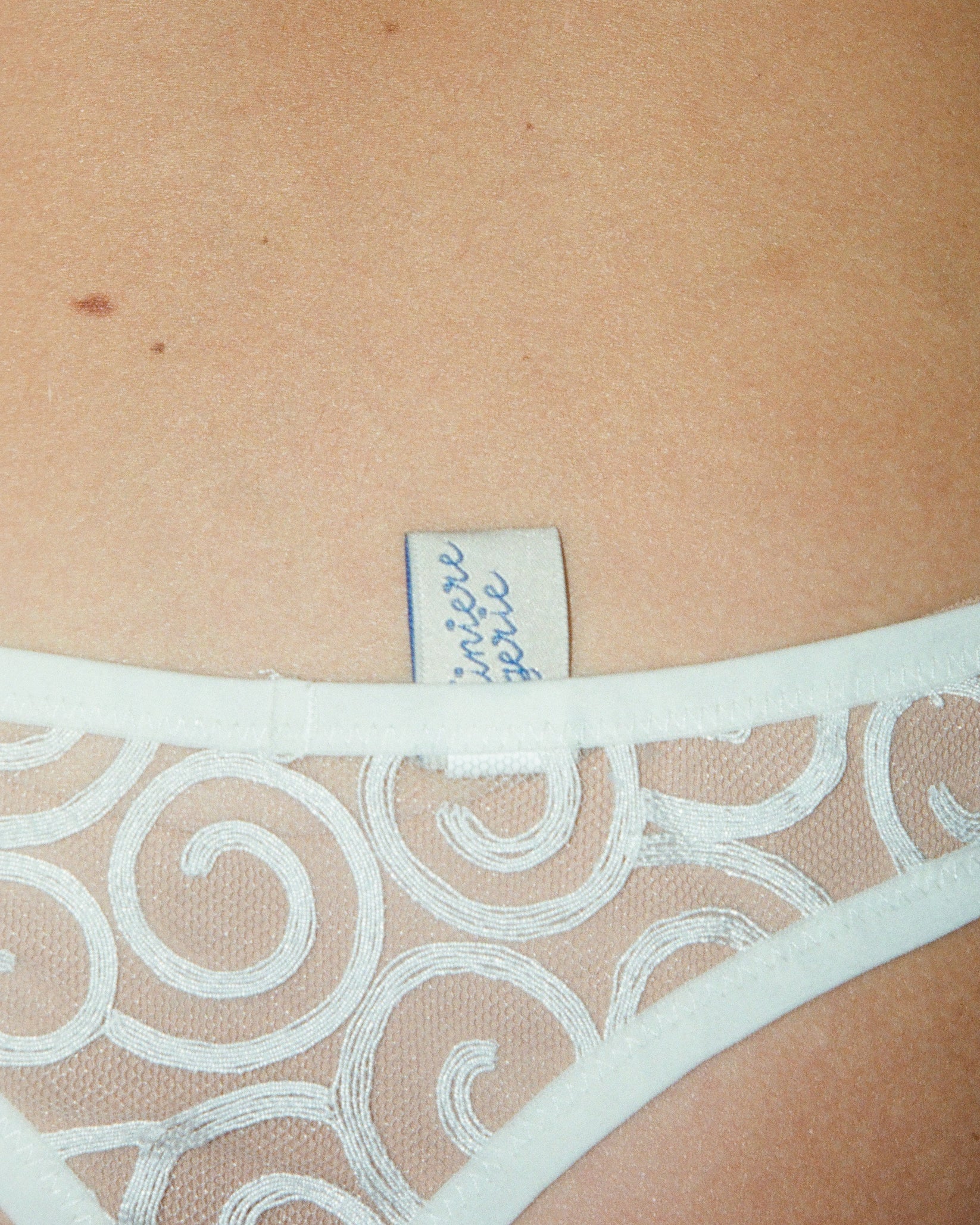 Soft Kiss Thong is mid waisted and made out of delicate French cotton embroidered swirl lace. An elegant yet comfortable piece of undergarment that pairs perfectly with the Soft Kiss Soft Bra.