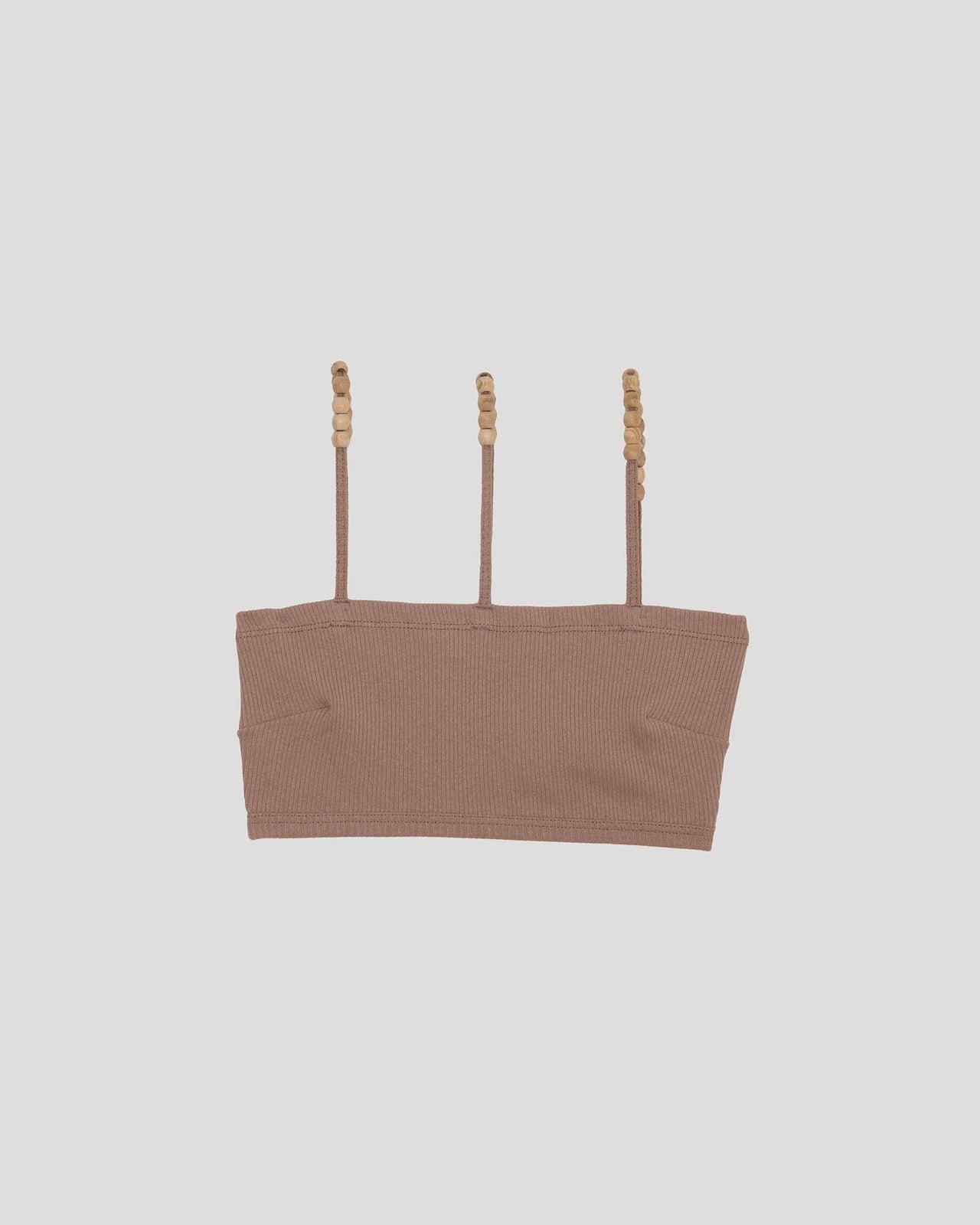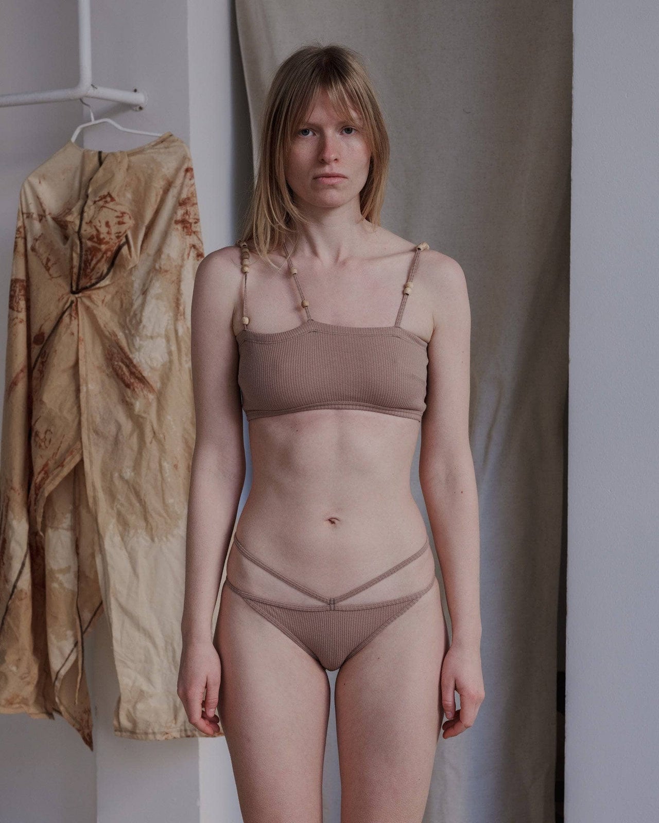 Fine cotton rib bra with an elastic trim at hem. Thin shoulder straps and third asymmetrical strap adorned with wooden beads . The bra is lined and provides very good support even for larger sizes