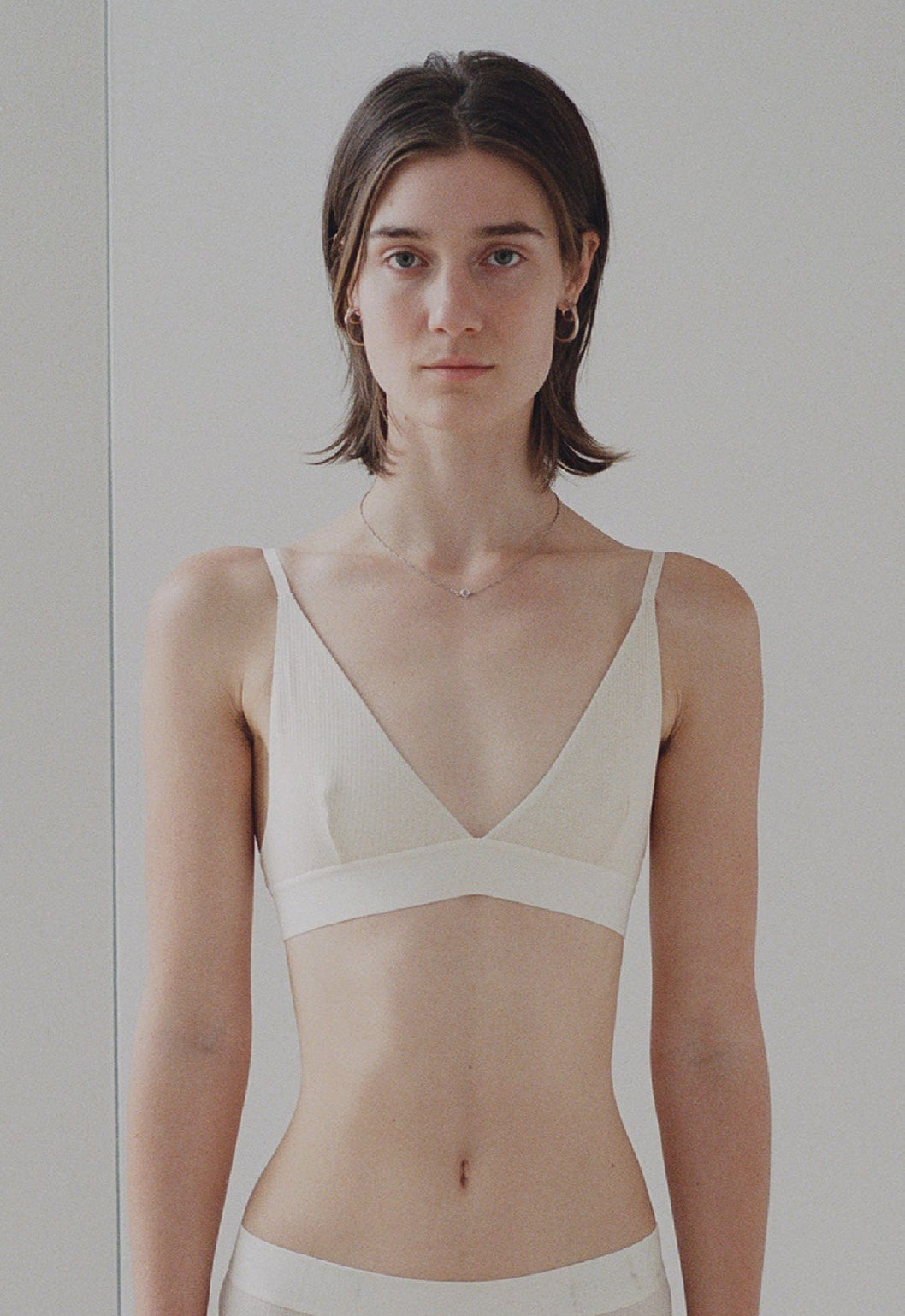 A soft cotton rib triangle bra featuring a thick elastic trim at the hem. The cups are lined and have thin adjustable shoulder straps. This bra is most supportive for a small to a medium bust.
