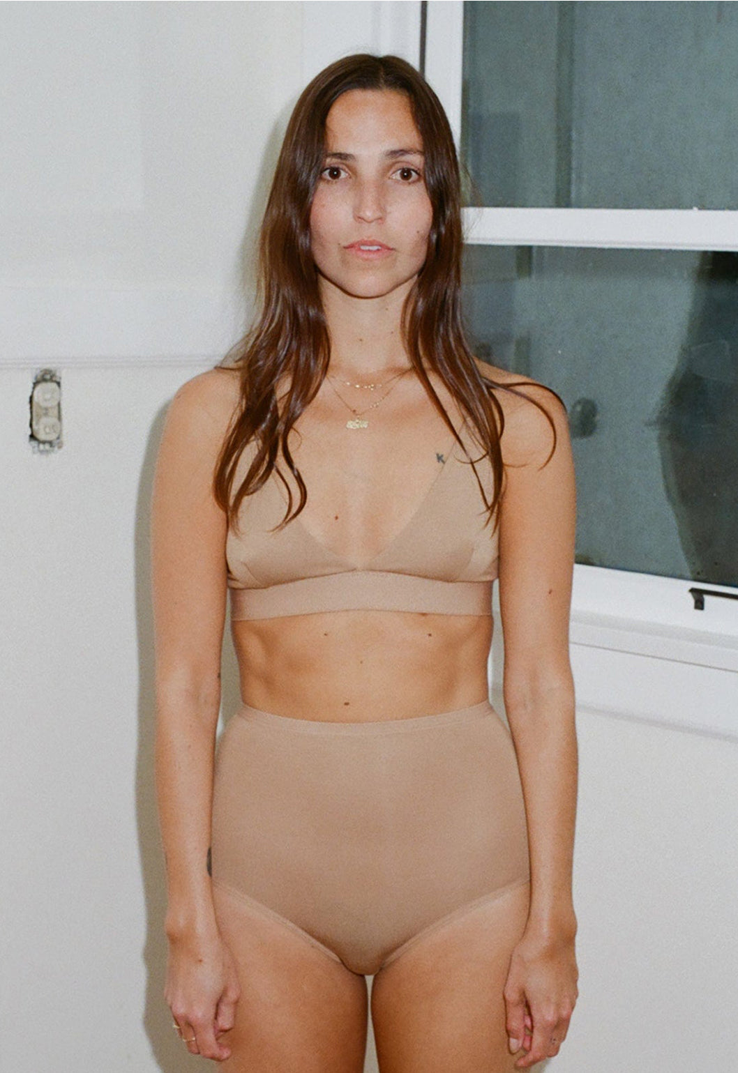 A soft bamboo jersey triangle bra featuring a thick elastic trim at the hem. The cups are lined and have thin adjustable shoulder straps. This bra is most supportive for a small to a medium bust.