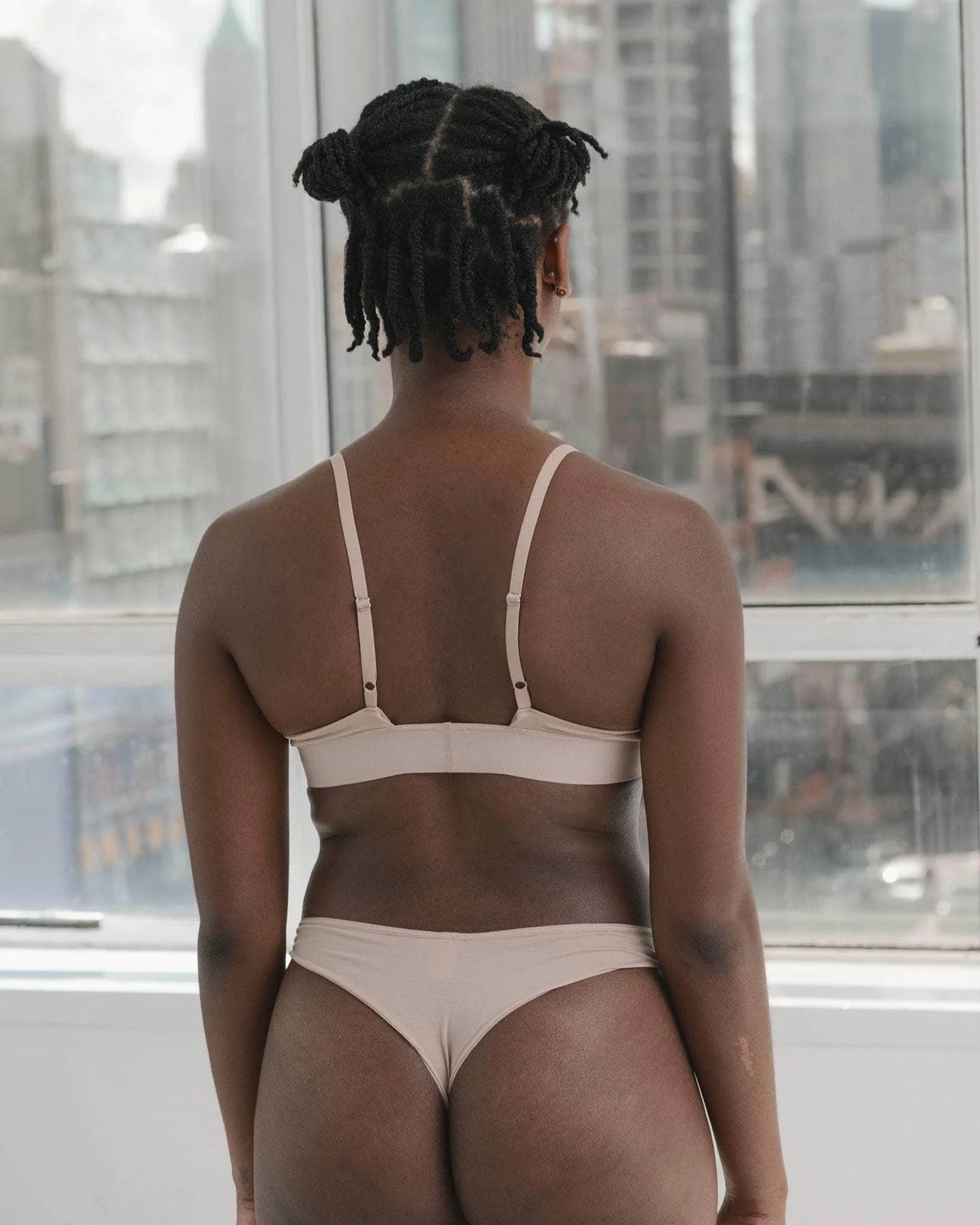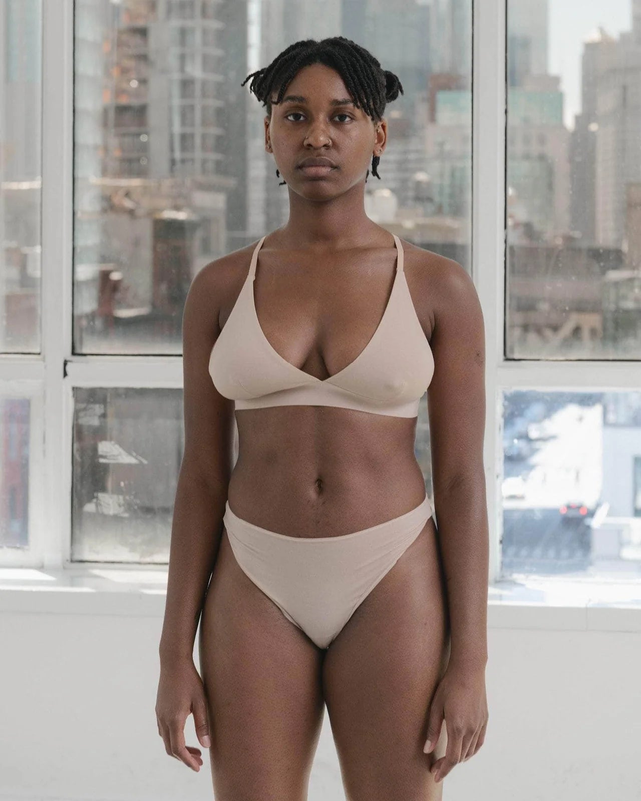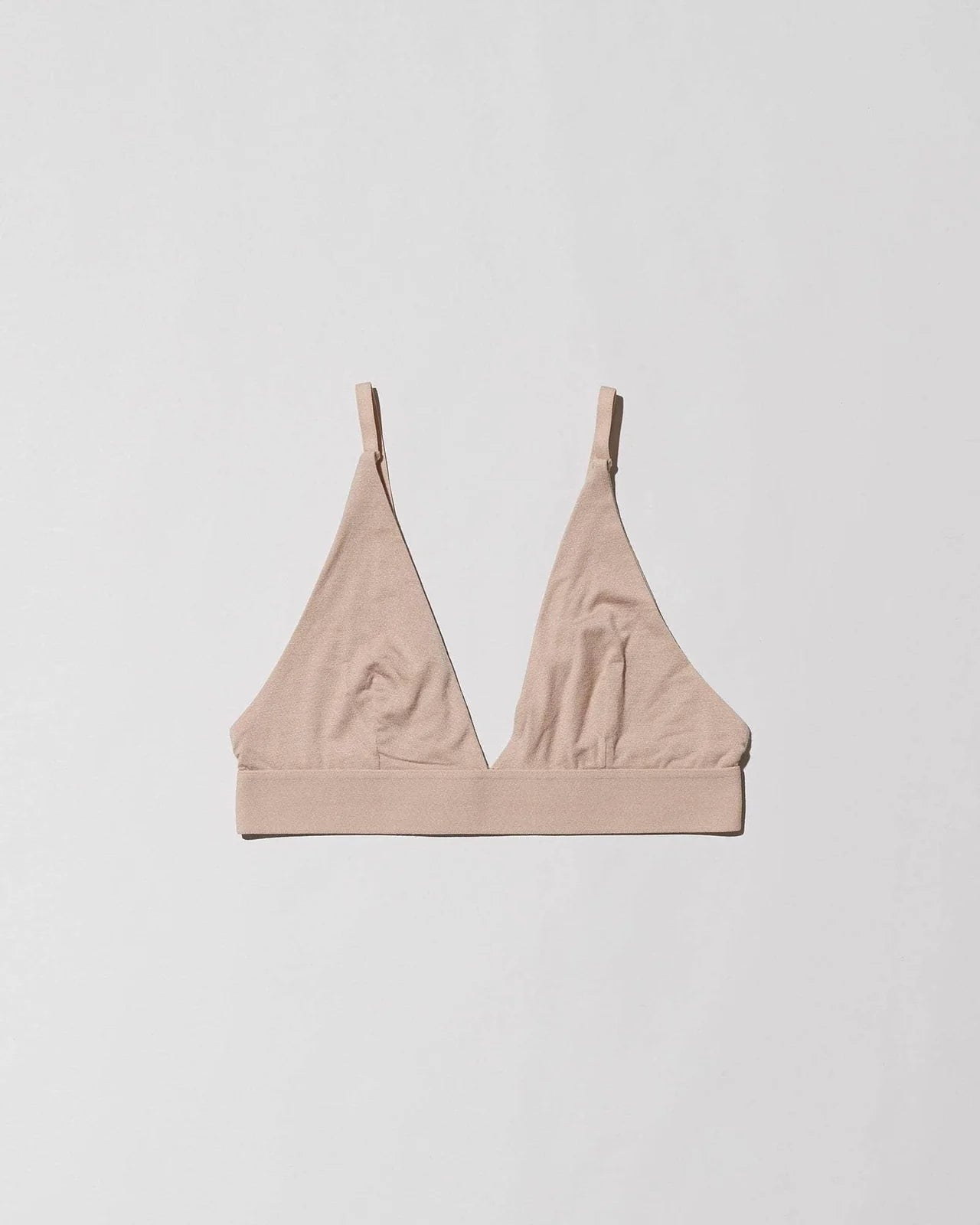 A soft bamboo jersey triangle bra featuring a thick elastic trim at the hem. The cups are lined and have thin adjustable shoulder straps. This bra is most supportive for a small to a medium bust.