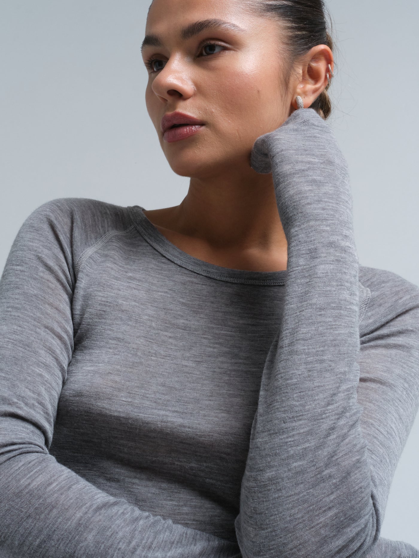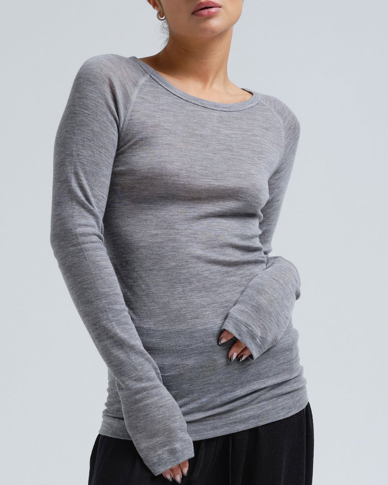 Long sleeved t-shirt crafted from mulesing-free merino wool and featuring a semi open round neck and raglan sleeves.
